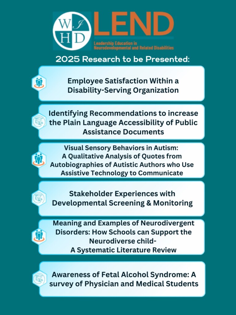 The LEND Program at WIHD is a two-semester interdisciplinary leadership training program. LEND trainees include graduate students and post-doctoral fellows; self-advocates; and family members of children and adults with disabilities. Through participating in LEND, trainees develop knowledge and skills they will need to become leaders working with and on behalf of children with disabilities and other special health care needs, and their families, to improve health outcomes and decrease disparities.